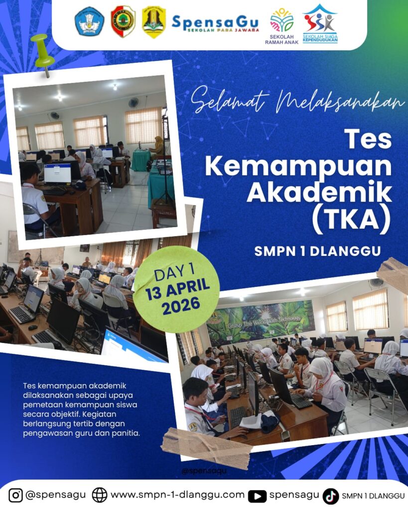 Terhitung mulai tanggal 13 April hingga 16 April 2026, siswa-siswi kelas 9 SMPN 1 Dlanggu akan menempuh kegiatan TKA. Ini adalah momen untuk membuktikan kerja keras dan dedikasi kalian selama ini.